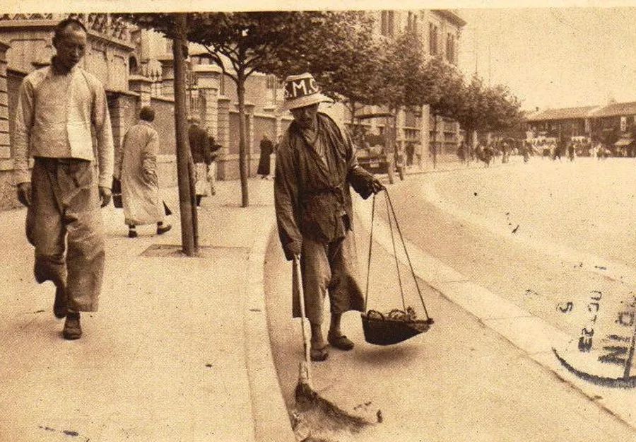 民國初年,上海街頭的清道夫。帽子上有S.M.C 字樣,意為上海工部局的英文縮寫