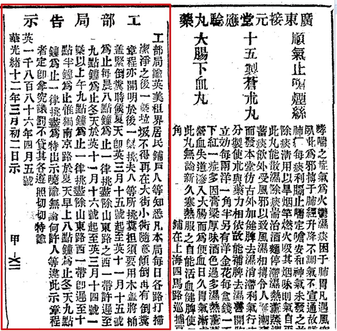 1886年4月30日《申報》刊登租界當局關于定時收集垃圾和糞便的通告