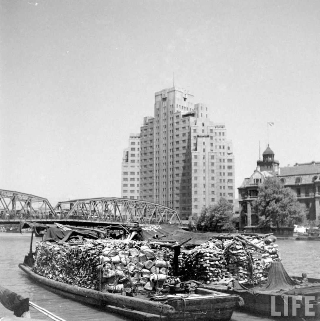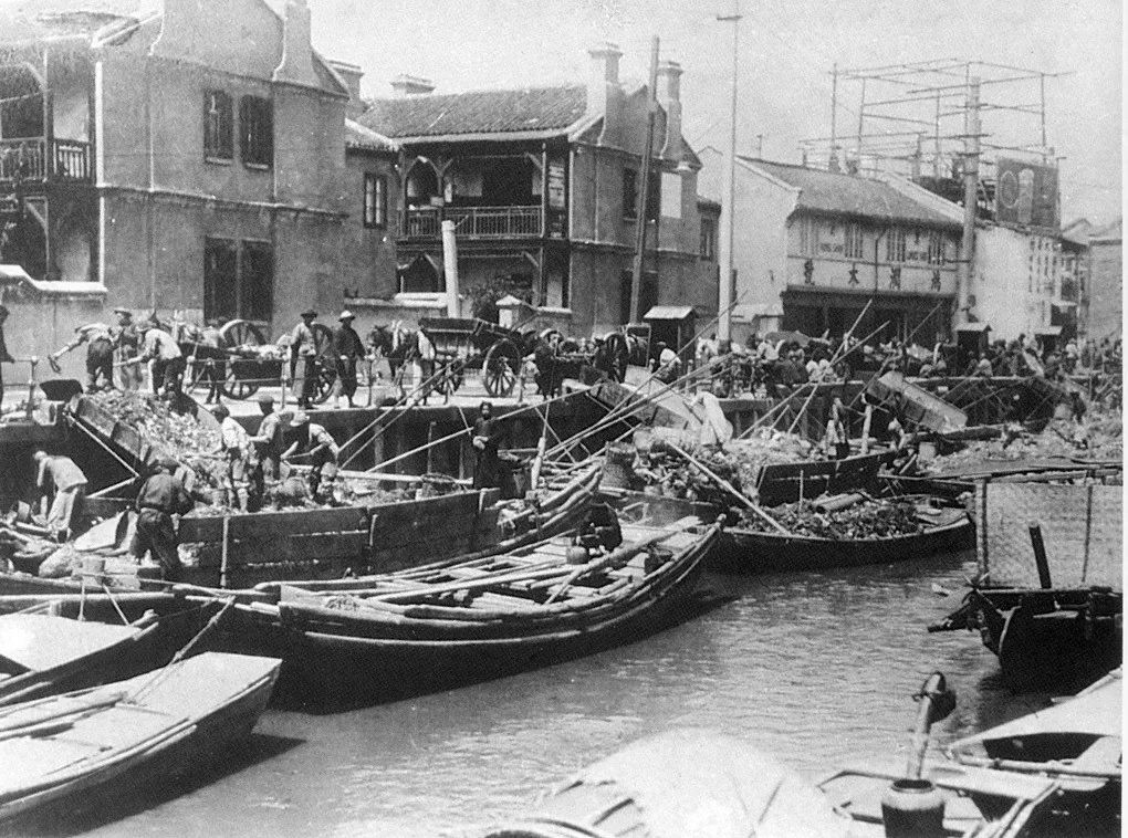 20世紀40年代后期,蘇州河口中運輸垃圾的駁船。圖中可見,裝載的垃圾已經(jīng)過初步歸類
