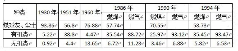 注:(1)1930年數(shù)據(jù)以公共租界統(tǒng)計資料為依據(jù);(2)1986年后居民生活垃圾成分為使用燃煤制品和煤氣兩類地區(qū)統(tǒng)計