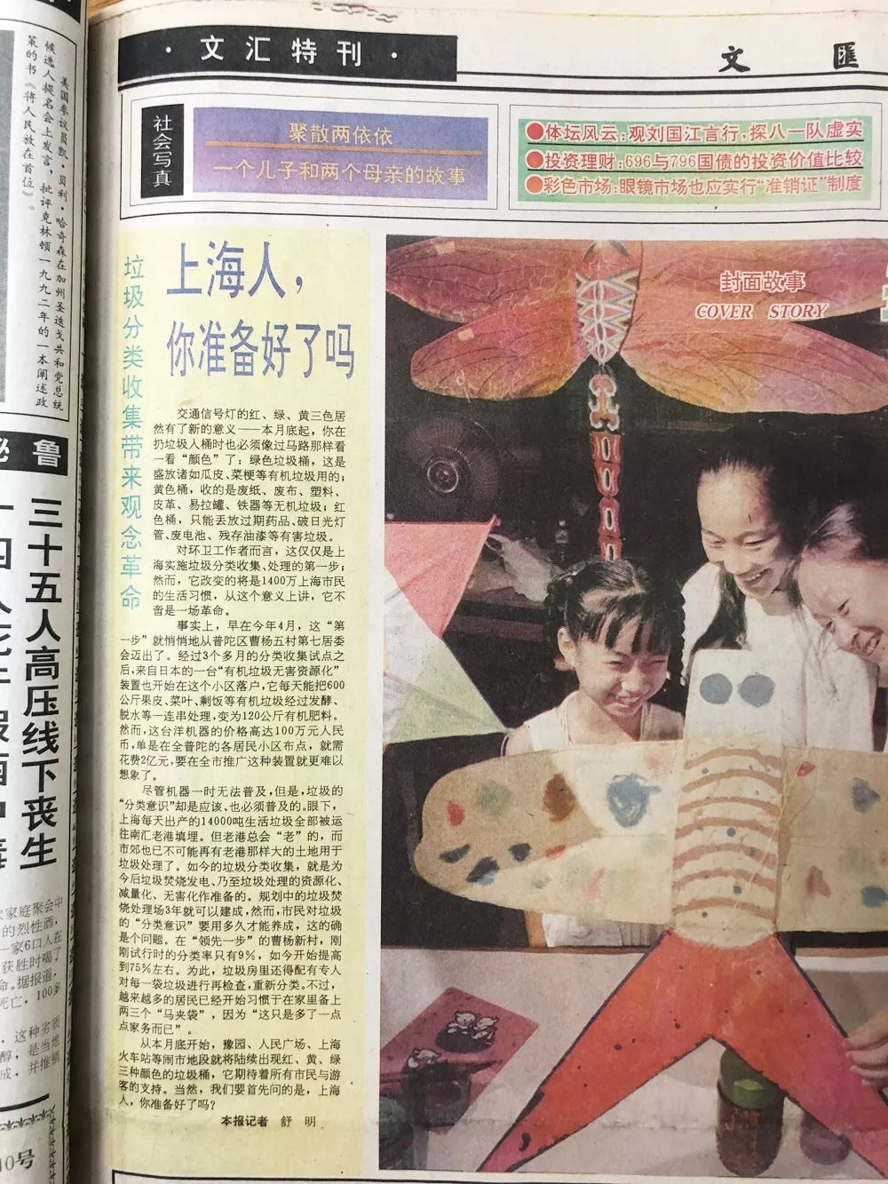 1996年8月17日《文匯報》文匯特刊版面刊載“垃圾分類收集帶來觀念革命 上海人,你準備好了嗎?”