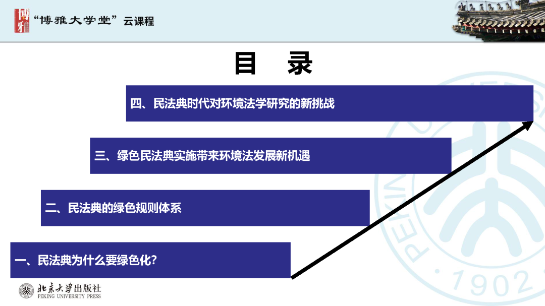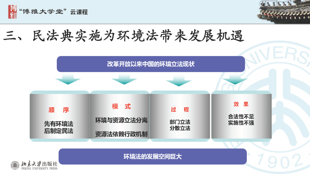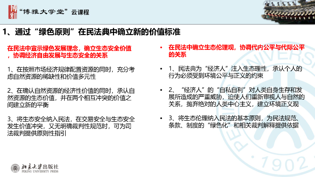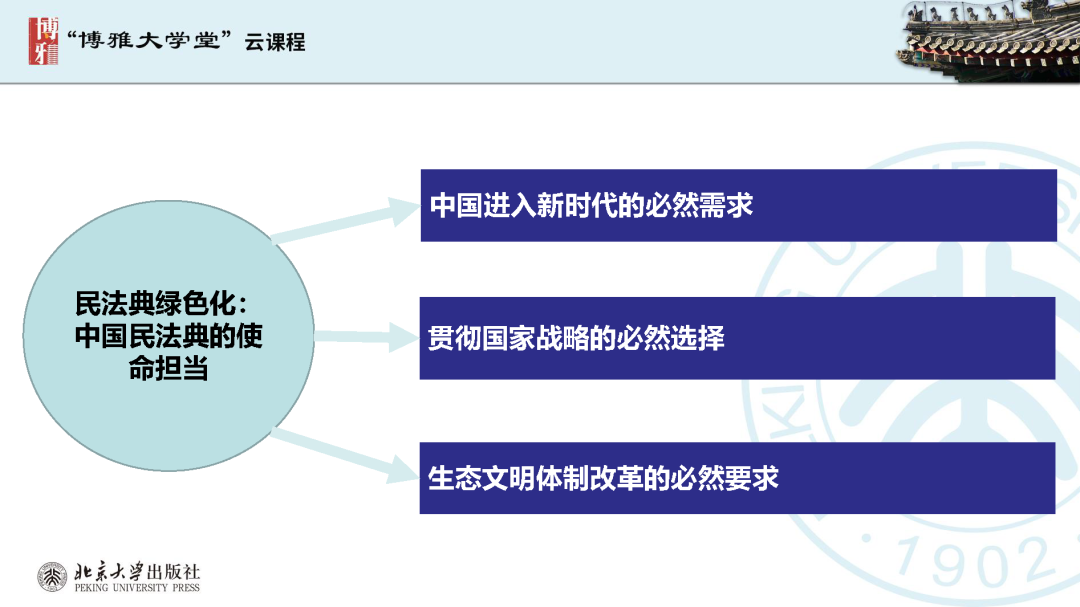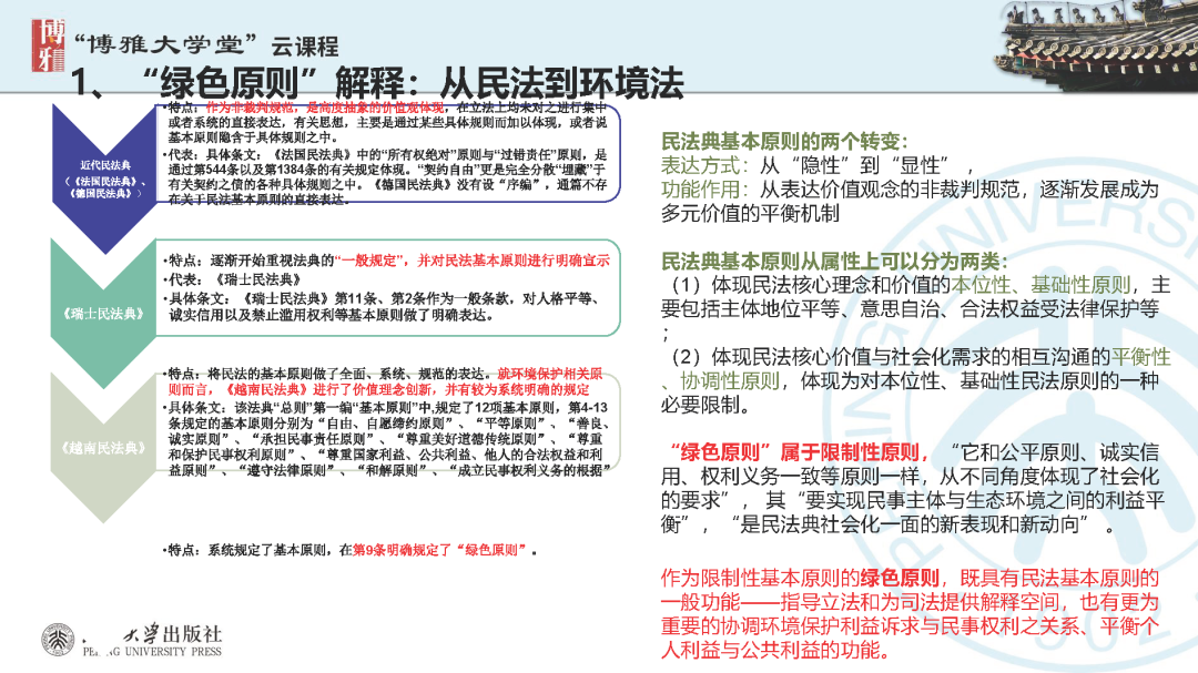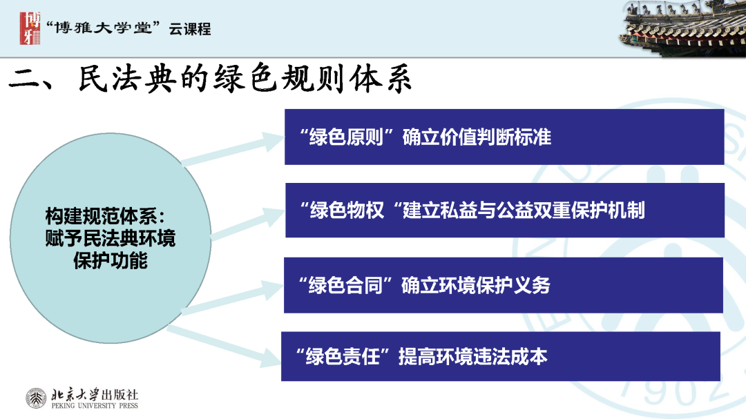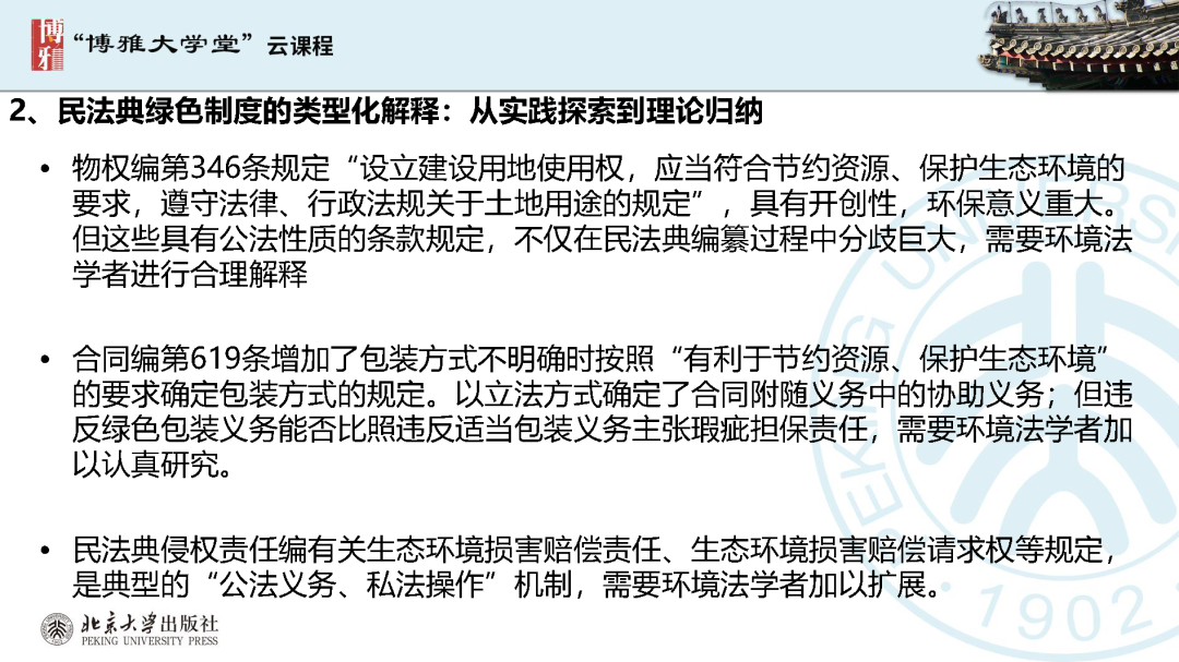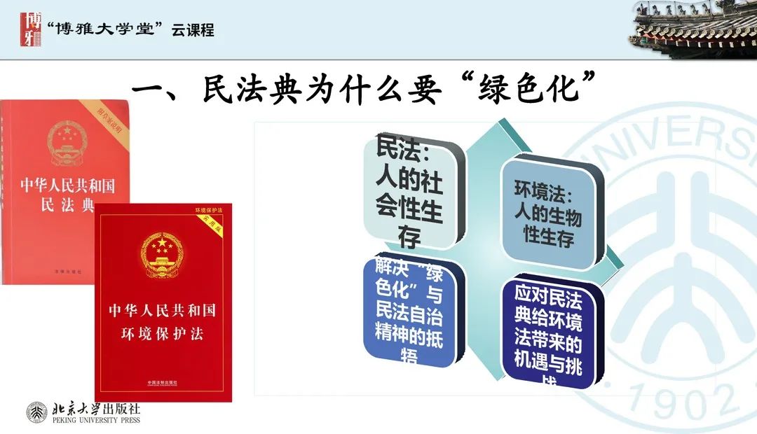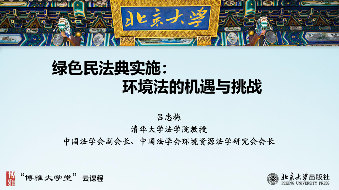 本文為呂忠梅老師在博雅大學(xué)堂上的報(bào)告。題目為《綠色民法典實(shí)施:環(huán)境法的機(jī)遇與挑戰(zhàn)》。內(nèi)容主要涉及民法典為什么要綠色化、民法典的綠色規(guī)則體系及綠色民法典給環(huán)境法帶來(lái)的新機(jī)遇和新挑戰(zhàn)。