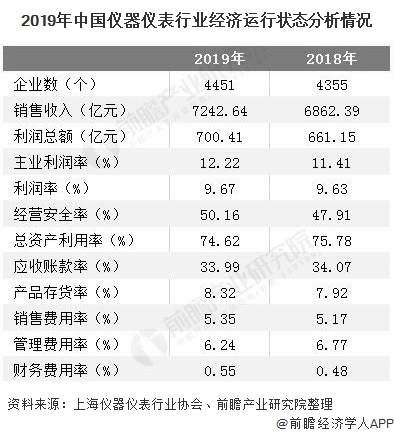 2019年儀器儀表行業(yè)除了總資產(chǎn)利用率、產(chǎn)品存貨率、銷(xiāo)售費(fèi)用率和財(cái)務(wù)費(fèi)用率四個(gè)較2018年同期有所下降外,其余指標(biāo)均實(shí)現(xiàn)了增長(zhǎng)。其中2019年儀器儀表行業(yè)實(shí)現(xiàn)銷(xiāo)售收入7242.64億元,同比增長(zhǎng)5.54%;實(shí)現(xiàn)利潤(rùn)總額700.41億元,同比增長(zhǎng)5.94%??傮w來(lái)看,儀器儀表行業(yè)運(yùn)行情況較為穩(wěn)定。