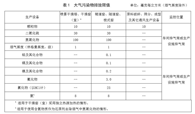 《排放標準》規(guī)定了陶瓷工業(yè)企業(yè)或生產(chǎn)設施的大氣污染物排放限值及控制要求、大氣污染物監(jiān)測、達標 判定要求和實施與監(jiān)督。