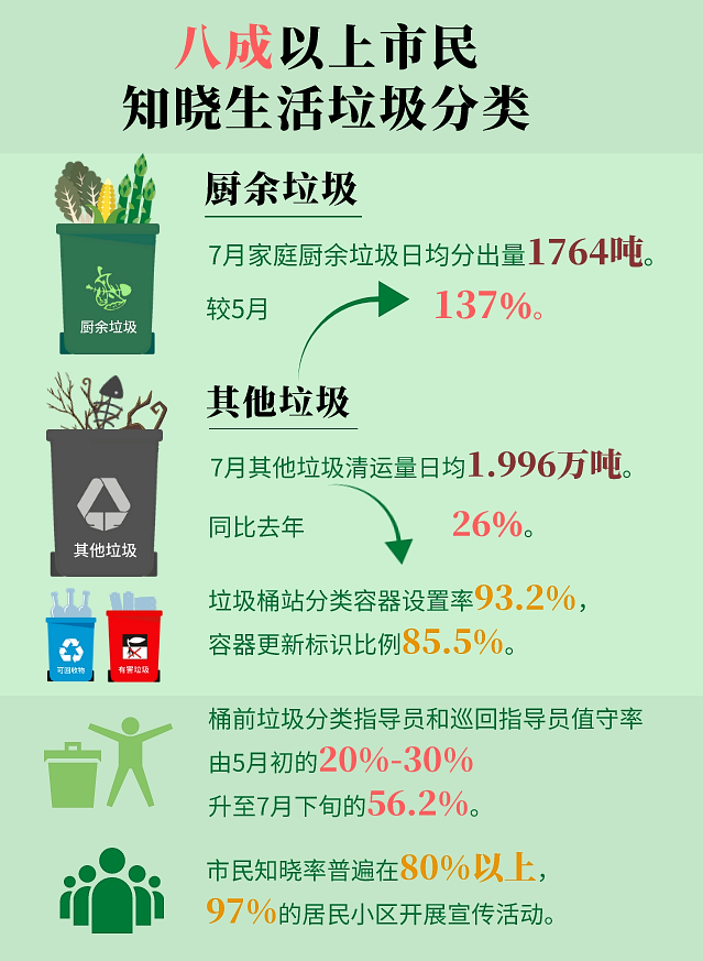 截至7月底,北京市家庭廚余垃圾日均分出量1764噸,較5月增長(zhǎng)了137%。