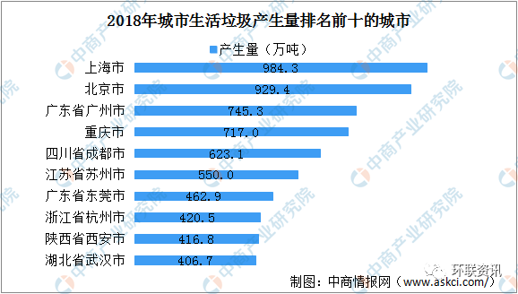 數(shù)據(jù)來(lái)源:生態(tài)環(huán)境部、中商產(chǎn)業(yè)研究院整理前十城市生活垃圾產(chǎn)生量共計(jì)6256.0萬(wàn)噸,占全部信息發(fā)布城市產(chǎn)生總量的29.6%。經(jīng)濟(jì)發(fā)達(dá)的城市生活垃圾產(chǎn)量大,上海、北京生活垃圾產(chǎn)生量超900萬(wàn)噸,分別為984.3萬(wàn)噸、929.4萬(wàn)噸。此外,廣州市、重慶市、成都市、蘇州市生活垃圾產(chǎn)生量超500萬(wàn)噸。