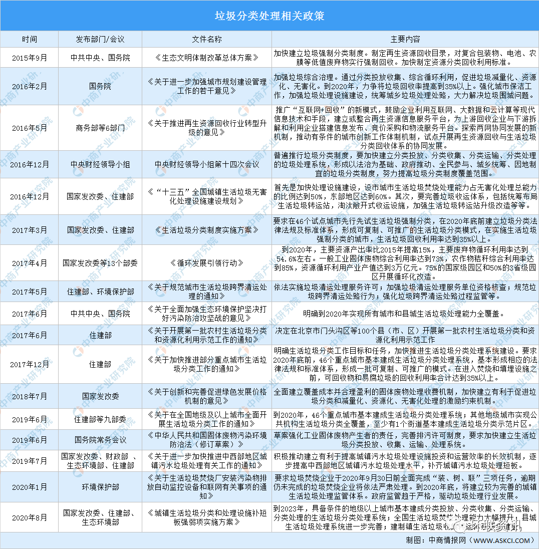 生活垃圾產(chǎn)量大,給城市環(huán)境帶來(lái)巨大的壓力,生活垃圾分類處理刻不容緩。2016年習(xí)近平總書(shū)記在中央財(cái)經(jīng)工作領(lǐng)導(dǎo)小組第十四次會(huì)議上指出,要普遍推行垃圾分類制度。此后,國(guó)家出臺(tái)了一系列政策,推動(dòng)垃圾處理產(chǎn)業(yè)發(fā)展。