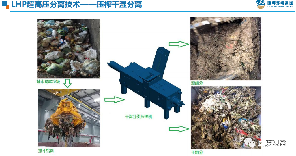 該項(xiàng)目設(shè)計(jì)規(guī)模是餐飲垃圾日處理400噸,廚余垃圾日處理600噸,糞污日處理1000噸,病死畜禽日處理40噸,合計(jì)設(shè)計(jì)規(guī)模2040噸,在近一年的實(shí)際運(yùn)營(yíng)期間,隨著廣州市垃圾分類和疫情的情況,產(chǎn)能結(jié)構(gòu)發(fā)生變化。主要特點(diǎn)是:1、垃圾分類不斷推進(jìn),廚余垃圾實(shí)際處理量增大;2、廣州舊城改造推進(jìn),糞污實(shí)際清運(yùn)和處理量比設(shè)計(jì)小;在實(shí)際運(yùn)營(yíng)中,其中餐飲垃圾目前處理量約500-600噸/天;廚余垃圾平均處理量約為1000噸/天,最高峰可達(dá)到近1200噸/日,占總處理量的一半以上。二、廣州項(xiàng)目的幾個(gè)亮點(diǎn)1. 朗坤環(huán)境集團(tuán)一直踐行如果對(duì)廚余垃圾去干榨凈,如何減少篩余物的含水率,提升篩余物的熱值?如何減少有機(jī)質(zhì)的流失?如何提升廚余垃圾的減量率?如何減少篩余物的外運(yùn)量?如何更好實(shí)現(xiàn)物質(zhì)的能源轉(zhuǎn)化?朗坤環(huán)境集團(tuán)研發(fā)的LHP超高壓分離技術(shù)真正對(duì)廚余垃圾做到了去干榨凈,通過在廣州項(xiàng)目一年多的應(yīng)用實(shí)踐,出渣易腐有機(jī)物比例達(dá)到了8-18%,預(yù)處理階段廚余垃圾整體減量達(dá)到了75-85%,僅有15-25%的篩余物外運(yùn)焚燒,實(shí)現(xiàn)了較高的減量率和有機(jī)質(zhì)提取率,工藝運(yùn)行穩(wěn)定、可靠,可以處理不破袋的廚余垃圾。