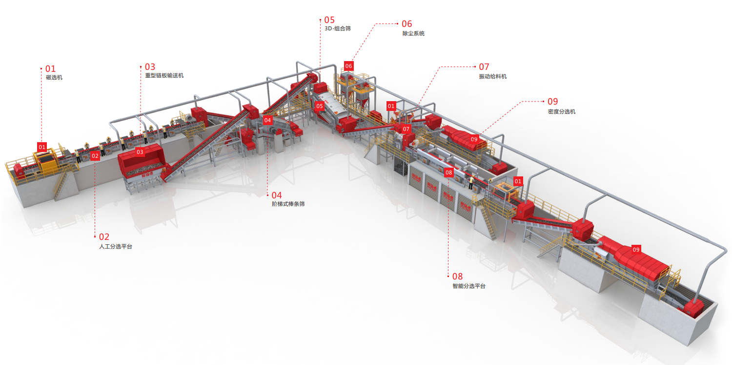 斯瑞德建筑裝修垃圾預(yù)處理方案利用不同的振動篩、馳張篩組成篩分系統(tǒng),將裝修垃圾按照尺寸進(jìn)行篩分,從而獲得不同尺寸的粉料、骨料;通過人工分選、智能分選、磁選等分選流程,回收紙板、廢舊金屬、塑料、木材等再生資源;采用風(fēng)選篩分出可以制造RDF的輕質(zhì)物料,實現(xiàn)裝修垃圾的價值最大化。