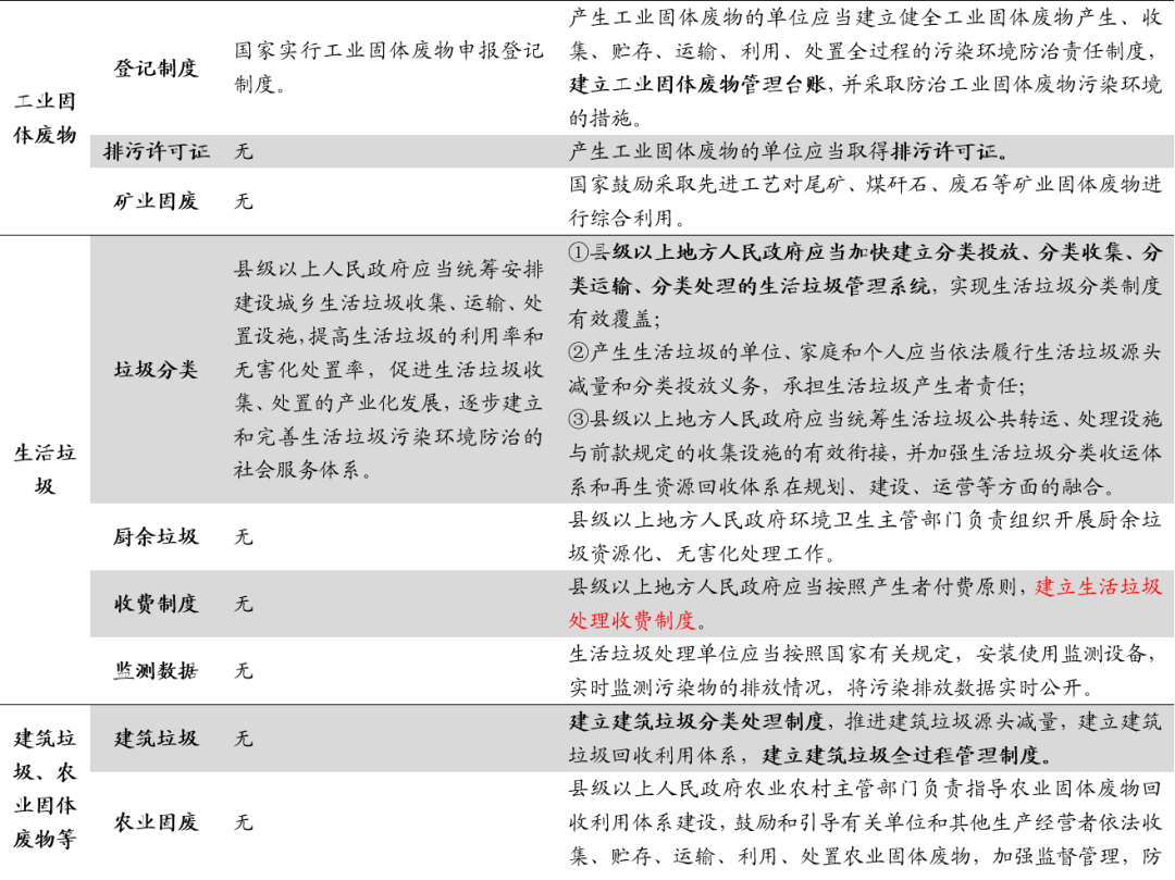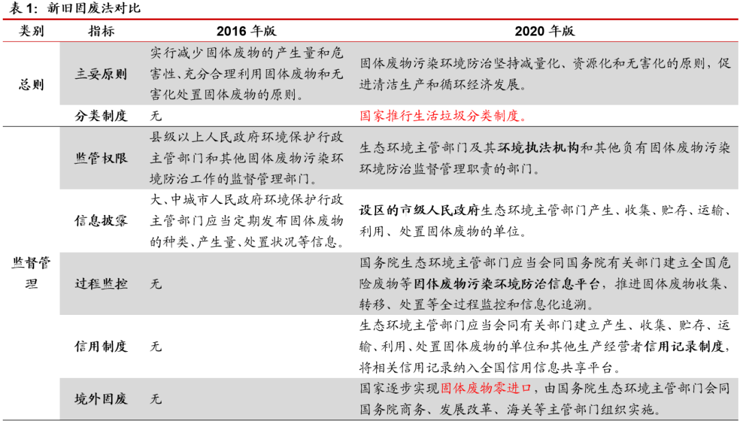 從具體內容上來看,相較于2016年修正版,新固廢法新增垃圾分類、污泥、建筑垃圾、醫(yī)療廢物、塑料制品等相關內容。垃圾分類方面:推行生活垃圾分類制度,建立差別化生活垃圾處理收費制度。將垃圾分類寫入新固廢法中,明確責任主體和收費制度,解決政策端和費用端兩大限制問題,為垃圾分類的順利開展提供保障。具體來看,1)新固廢法提出國家推行生活垃圾分類制度,要求縣級以上地方人民政府應當加快建立分類投放、分類收集、分類運輸、分類處理的生活垃圾管理系統(tǒng),實現(xiàn)生活垃圾分類制度有效覆蓋;2)縣級以上地方人民政府應當按照產生者付費原則,建立生活垃圾處理收費制度,縣級以上地方人民政府制定生活垃圾處理收費標準,應當根據(jù)本地實際,結合生活垃圾分類情況,體現(xiàn)分類計價、計量收費等差別化管理。污泥處理方面:關注污泥處理,促進污水污泥處理系統(tǒng)協(xié)同發(fā)展。污水處理過程中常有“重水輕泥”等問題,污泥處理技術較弱,新固廢法將污泥處理管理列入監(jiān)管范圍,明確污泥處理標準,從而促進污泥穩(wěn)定化、減量化和無害化處理。具體來看,1)城鎮(zhèn)污水處理設施維護運營單位或者污泥處理單位應當安全處理污泥,保證處理后的污泥符合國家有關標準,對污泥的流向、用途、用量等進行跟蹤、記錄,并報告城鎮(zhèn)排水主管部門、生態(tài)環(huán)境主管部門??h級以上人民政府城鎮(zhèn)排水主管部門應當將污泥處理設施納入城鎮(zhèn)排水與污水處理規(guī)劃,推動同步建設污泥處理設施與污水處理設施,鼓勵協(xié)同處理,污水處理費征收標準和補償范圍應當覆蓋污泥處理成本和污水處理設施正常運營成本。2)禁止擅自傾倒、堆放、丟棄、遺撒城鎮(zhèn)污水處理設施產生的污泥和處理后的污泥。建筑垃圾方面:建立建筑垃圾分類處理和全過程管理制度。新固廢法將建筑垃圾單獨提出,有利于其實現(xiàn)獨立管理,促進我國促進我國建筑垃圾分類處理、回收利用、全過程管理的制度和體系的建立。具體來看,1)縣級以上地方人民政府應當加強建筑垃圾污染環(huán)境的防治,建立建筑垃圾分類處理制度;2)縣級以上地方人民政府環(huán)境衛(wèi)生主管部門負責建筑垃圾污染環(huán)境防治工作,建立建筑垃圾全過程管理制度,規(guī)范建筑垃圾產生、收集、貯存、運輸、利用、處置行為,推進綜合利用,加強建筑垃圾處置設施、場所建設,保障處置安全,防止污染環(huán)境。醫(yī)療廢物方面:新增醫(yī)療廢物管理機制,加強醫(yī)廢集中處置能力。疫情引發(fā)公眾對于醫(yī)療廢物處理處置的關注,也暴露出醫(yī)廢處理處置能力上的缺口,新固廢法新增醫(yī)療廢物管理的相關規(guī)定,從法律層面補足短板,促進未來管理的規(guī)范化和處置能力的進一步提升。具體來看,1)明確醫(yī)療廢物按照國家危險廢物名錄管理:“縣級以上地方人民政府應當加強醫(yī)療廢物集中處置能力建設”;2)明確監(jiān)管職責:“縣級以上人民政府衛(wèi)生健康、生態(tài)環(huán)境等主管部門應當在各自職責范圍內加強對醫(yī)療廢物收集、貯存、運輸、處置的監(jiān)督管理,防止危害公眾健康、污染環(huán)境”;3)突出主體責任:“醫(yī)療衛(wèi)生機構應當依法分類收集本單位產生的醫(yī)療廢物,交由醫(yī)療廢物集中處置單位處置。醫(yī)療廢物集中處置單位應當及時收集、運輸和處置醫(yī)療廢物;醫(yī)療衛(wèi)生機構和醫(yī)療廢物集中處置單位,應當采取有效措施,防止醫(yī)療廢物流失、泄漏、滲漏、擴散?!保?strong>4)完善應急保障機制:“重大傳染病疫情等突發(fā)事件發(fā)生時,縣級以上人民政府應當統(tǒng)籌協(xié)調醫(yī)療廢物等危險廢物收集、貯存、運輸、處置等工作,保障所需的車輛、場地、處置設施和防護物資?!薄?/span>危險廢物方面:實施危廢分級分類管理,鼓勵區(qū)域合作集中處置。新固廢法首次提出危廢實施分級分類管理,對于部分危廢的部分環(huán)節(jié)實行豁免管理,為危廢分級提供法律依據(jù),在規(guī)范化管理的前提下進一步提升危廢處理處置效率,此外,區(qū)域合作處置措施的推進也將進一步解決危廢處置產能錯配等結構性問題。具體來看,1)新增分級管理:“國務院生態(tài)環(huán)境主管部門根據(jù)危險廢物的危害特性和產生數(shù)量,科學評估其環(huán)境風險,實施分級分類管理,建立信息化監(jiān)管體系,并通過信息化手段管理、共享危險廢物轉移數(shù)據(jù)和信息”;2)鼓勵區(qū)域合作:“相鄰省、自治區(qū)、直轄市之間可以開展區(qū)域合作,統(tǒng)籌建設區(qū)域性危險廢物集中處置設施、場所”。塑料制品方面:拒絕過度包裝,禁止限制一次性塑料制品。針對近年來較為嚴重的過度包裝和一次性塑料制品使用問題,新固廢法明確禁止不可降解一次性塑料制品,鼓勵推廣可降解替代產品,疊加近期各省市出臺的限塑令,可進一步加強塑料污染治理,限制不可降解塑料的使用量。具體來看,1)國家依法禁止、限制生產、銷售和使用不可降解塑料袋等一次性塑料制品;2)國家鼓勵和引導減少使用、積極回收塑料袋等一次性塑料制品,推廣應用可循環(huán)、易回收、可降解的替代產品。