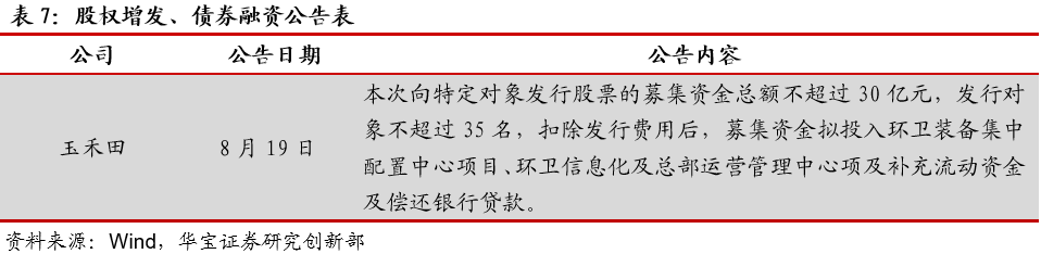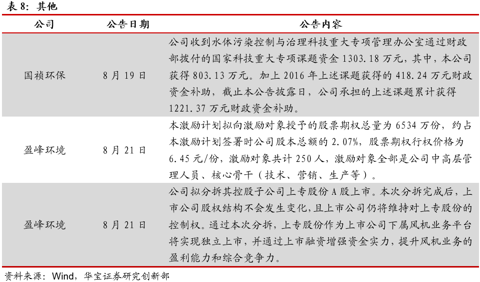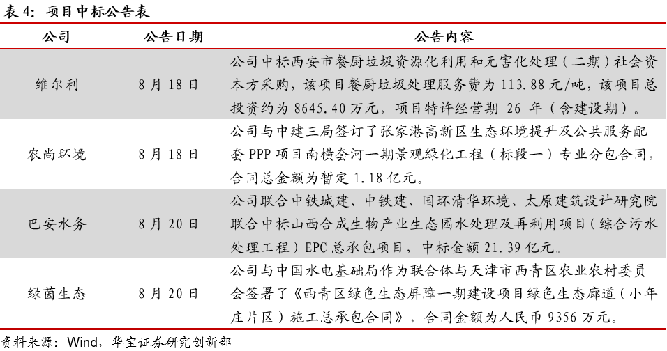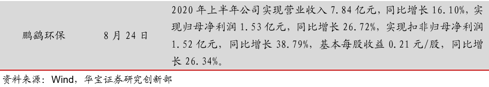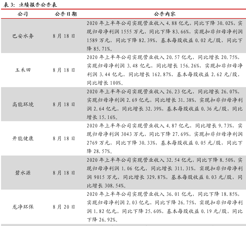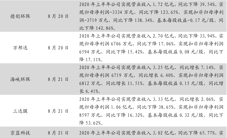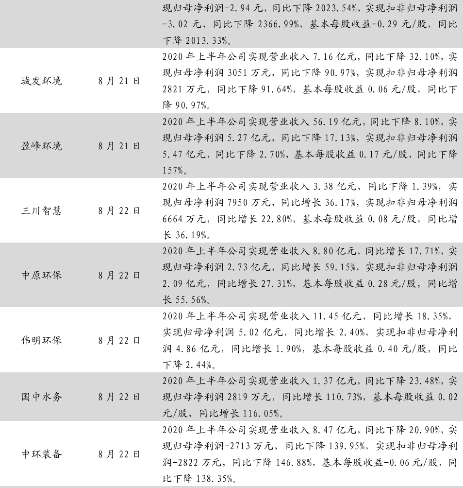 住建部公布《城鎮(zhèn)排水許可管理辦法(征求意見稿)》住建部近日就《城鎮(zhèn)排水許可管理辦法(征求意見稿)》公開征求意見,旨在加強對污水排入城鎮(zhèn)排水管網的管理,保障城鎮(zhèn)排水與污水處理設施安全運行,防治城鎮(zhèn)水污染。其中,排水戶未按照本辦法規(guī)定及時向城鎮(zhèn)排水主管部門申請辦理變更的,由城鎮(zhèn)排水主管部門責令改正,可以處5000元以上3萬元以下罰款。生態(tài)環(huán)境部通報7月和1-7月全國地表水、環(huán)境空氣質量狀況生態(tài)環(huán)境部今日向媒體通報了2020年7月和1-7月全國地表水、環(huán)境空氣質量狀況。7月,1940個國家地表水考核斷面中,水質優(yōu)良(Ⅰ-Ⅲ類)斷面比例為73.3%,同比上升1.6個百分點;劣Ⅴ類斷面比例為2.7%,同比下降2.7個百分點。主要污染指標為總磷、高錳酸鹽指數(shù)和化學需氧量。7月,全國337個地級及以上城市平均優(yōu)良天數(shù)比例為90.3%,同比上升4.9個百分點;PM2.5濃度為19微克/立方米,同比下降5.0%;PM10濃度為37微克/立方米,同比下降7.5%;O3濃度為138微克/立方米,同比下降5.5%;SO2濃度為8微克/立方米,同比持平;NO2濃度為17微克/立方米,同比下降10.5%;CO濃度為0.8毫克/立方米,同比持平。湖北省印發(fā)《湖北省疫后重振補短板強功能“十大工程”三年行動方案(2020—2022年)》近日,湖北省印發(fā)《湖北省疫后重振補短板強功能“十大工程”三年行動方案(2020—2022年)》,啟動疫后重振“十大工程”。根據(jù)《方案》,湖北省將聚焦公共衛(wèi)生體系、交通、水利、能源、新基建、冷鏈物流和應急儲備設施、城市、產業(yè)園區(qū)提升、新一輪高標準農田建設、生態(tài)環(huán)境等十大領域,用三年時間實施一批打基礎、補短板、強功能、利長遠、惠民生的重大項目。截至目前,“十大工程”滾動項目庫項目達4572個,估算總投資約2.3萬億元。為補生態(tài)環(huán)境補短板,湖北省三年內湖北省擬實施項目419個,估算總投資1744億元。到2022年底,健全全省醫(yī)療廢物和危險廢物的收集、轉運、處置和利用體系。完成沿江1公里范圍內化工企業(yè)關改搬轉。湖北省將選擇在80個縣級市(包括部分人口數(shù)量較大的重點鄉(xiāng)鎮(zhèn))建設醫(yī)療廢物、危險廢物的收集、轉運設施。建立循環(huán)型全生命周期綠色產業(yè)鏈,實現(xiàn)園區(qū)資源高效、循環(huán)利用和廢物“零排放”。江蘇印發(fā)《關于推進生態(tài)環(huán)境治理體系和治理能力現(xiàn)代化的實施意見》江蘇是塑料制品的生產、流通和消費大省。近日,江蘇省發(fā)展和改革委員會、江蘇省生態(tài)環(huán)境廳聯(lián)合印發(fā)了《關于進一步加強塑料污染治理的實施意見》。總體目標:到2020年,率先在部分地區(qū)、部分領域禁止、限制部分塑料制品的生產、銷售和使用。到2022年,全省一次性塑料制品消費量明顯減少,替代產品得到推廣,塑料廢棄物資源化能源化利用比例大幅提升;在塑料污染問題突出領域和電商、快遞、外賣等新興領域,形成一批可復制、可推廣的塑料減量和綠色物流模式。到2025年,全省塑料制品生產、流通、消費和回收處置等環(huán)節(jié)的管理制度基本建立,多元共治體系基本形成,替代產品開發(fā)應用水平進一步提升,塑料垃圾填埋量不斷降低,塑料污染得到有效控制。其中,南京市塑料垃圾填埋量大幅降低。江蘇省發(fā)改委、生態(tài)環(huán)境廳聯(lián)合印發(fā)《關于進一步加強塑料污染治理的實施意見》江蘇是塑料制品的生產、流通和消費大省。近日,江蘇省發(fā)展和改革委員會、江蘇省生態(tài)環(huán)境廳聯(lián)合印發(fā)了《關于進一步加強塑料污染治理的實施意見》。總體目標:到2020年,率先在部分地區(qū)、部分領域禁止、限制部分塑料制品的生產、銷售和使用。到2022年,全省一次性塑料制品消費量明顯減少,替代產品得到推廣,塑料廢棄物資源化能源化利用比例大幅提升;在塑料污染問題突出領域和電商、快遞、外賣等新興領域,形成一批可復制、可推廣的塑料減量和綠色物流模式。到2025年,全省塑料制品生產、流通、消費和回收處置等環(huán)節(jié)的管理制度基本建立,多元共治體系基本形成,替代產品開發(fā)應用水平進一步提升,塑料垃圾填埋量不斷降低,塑料污染得到有效控制。其中,南京市塑料垃圾填埋量大幅降低。關于公開征求《吉林省生態(tài)環(huán)境保護條例(草案)》修改意見的通知日前,吉林日報全文刊發(fā)關于公開征求《吉林省生態(tài)環(huán)境保護條例(草案)》修改意見的通知。通知指出,縣級以上人民政府應當落實國家綠色循環(huán)低碳發(fā)展的經濟政策,建立與經濟社會發(fā)展水平相適應的生態(tài)環(huán)境保護財政投入和多元化投融資機制。加強生態(tài)環(huán)境保護公共基礎設施建設,鼓勵和支持生態(tài)環(huán)境保護技術研發(fā)、推廣和應用。4. 重點跟蹤公司動態(tài)
