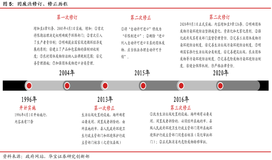 新固廢法將于9月正式實施,推動固廢全產業(yè)鏈發(fā)展。第十三屆全國人民代表大會常務委員會第十七次會議于2020年4月29日修訂通過《中華人民共和國固體廢物污染環(huán)境防治法》(簡稱新固廢法),自2020年9月1日正式實施。我國固廢法于1996年4月1日正式實施,2004年進行了第一次修訂,引入生產者責任制,2013年、2015年、2016年先后進行了三次修正,本次是固廢法時隔15年的第二次修訂。本次修訂版內容由原先的六章91條增加至九章126條,2020年修訂版在2016年版的基礎上,細化工業(yè)固體廢物、生活垃圾、危險廢物的相關規(guī)定,新增建筑垃圾、農業(yè)固體廢物及保障措施的相關內容。新固廢法對固體廢物產生、收集、貯存、運輸、利用、處置全過程提出更高的防治要求,將進一步帶動固廢行業(yè)的穩(wěn)健可持續(xù)發(fā)展。