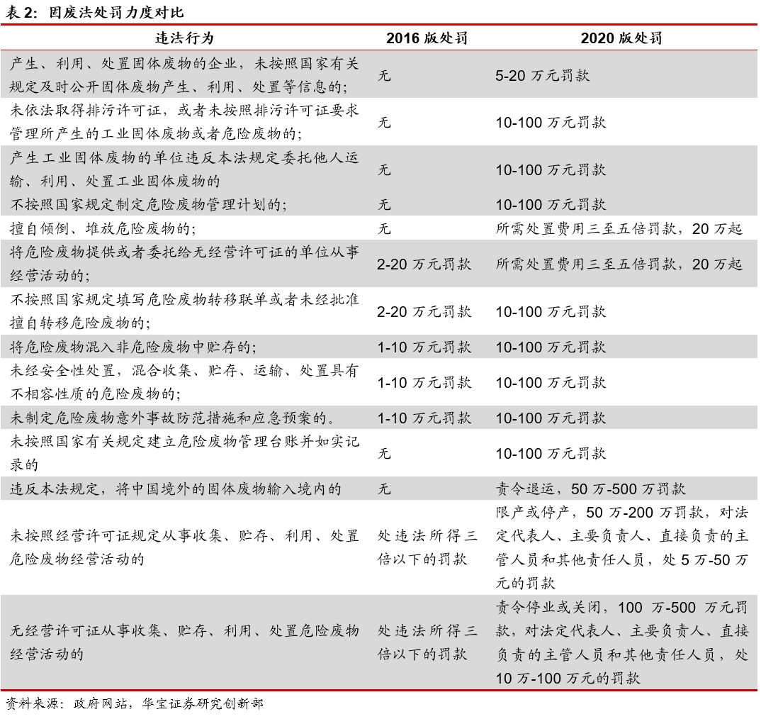 新固廢法嚴懲重罰,大幅提高違法成本。新固廢法除細化完善固體廢物的相關管理制度外,還嚴格落實法律責任,增加罰款種類、加大處罰力度、提高處罰額度。具體來看,1)對于相關違法行為,新固廢法加重處罰措施,提高罰款額度,最高可罰款500萬元,且多項違法行為的罰款額度是原固廢法的十倍;2)新固廢法增加按日連續(xù)處罰規(guī)定,對于違法受罰單位和其他生產經營者,被發(fā)現(xiàn)其繼續(xù)實施該違法行為的,實行按日連續(xù)處罰;3)新固廢法實行“雙罰制”,對于特定的違法行為,除對企業(yè)本身進行行政處罰外,同時對企業(yè)的相關負責人進行處罰。