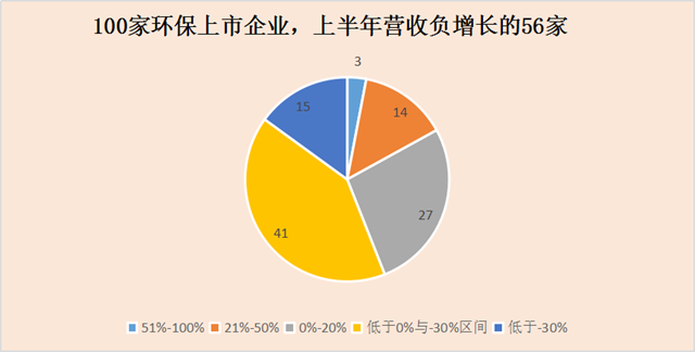 營收變動(dòng)幅度方面,數(shù)據(jù)不那么喜人。100家環(huán)保上市企業(yè),上半年?duì)I收同比下滑,負(fù)增長有56家,接近6成。也就是說,一半以上的企業(yè)主營業(yè)務(wù)收入都不及往年。(如圖四)