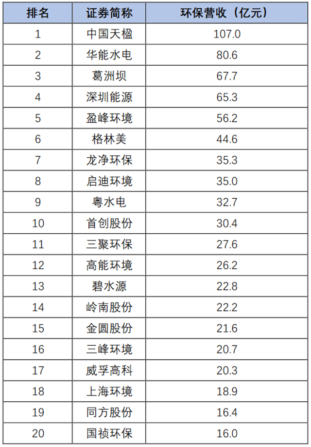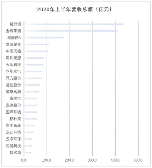 2020年上半年A股環(huán)保上市公司環(huán)保營收TOP20