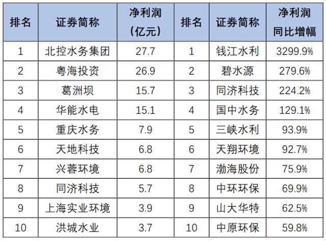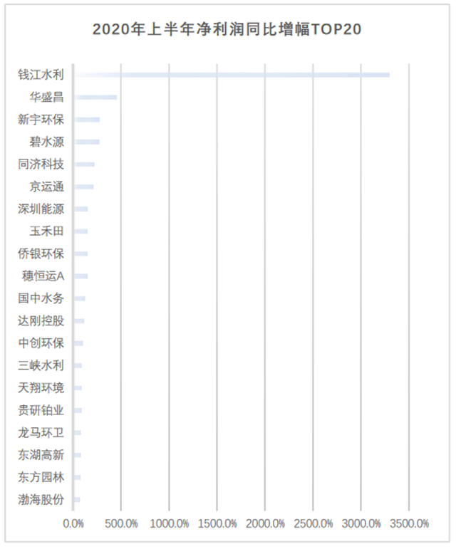 2020年上半年水務(wù)(A股+港股)環(huán)保上市公司凈利潤及其同比增幅TOP10