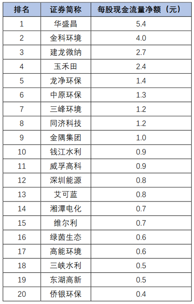 2020年上半年A股環(huán)保上市公司每股現(xiàn)金流量凈額TOP20
