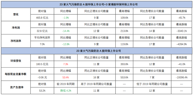 大氣污染防治領(lǐng)域(26家):營收規(guī)模收縮,環(huán)保營收規(guī)模增長,獲利能力下滑,現(xiàn)金流情況有所改善,負債水平下降。