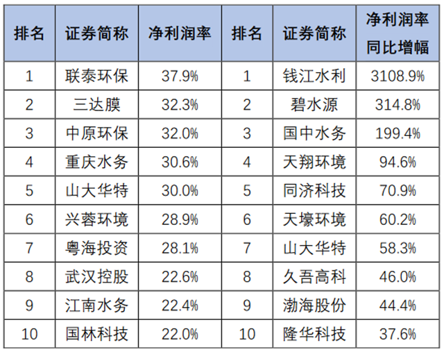 2020年上半年水務(wù)(A股+港股)環(huán)保上市公司凈利潤率及其同比增幅TOP10