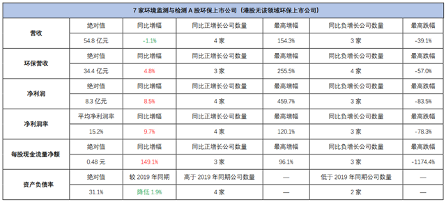 環(huán)境監(jiān)測與檢測領(lǐng)域(7家):營收規(guī)模收縮,環(huán)保營收規(guī)模和獲利能力雙增長,現(xiàn)金流情況改善明顯,負債水平小幅下降。