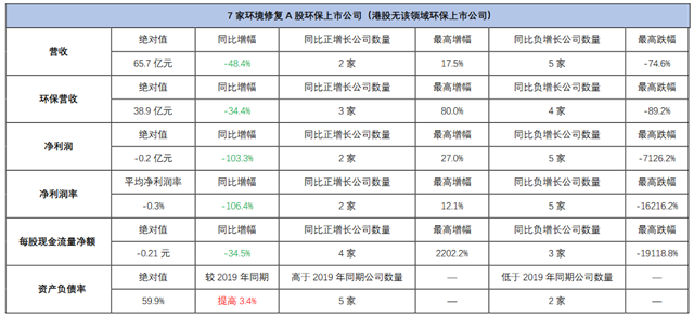 環(huán)境修復(fù)領(lǐng)域(7家):營收和環(huán)保營收規(guī)模均收縮,獲利能力大幅下滑,現(xiàn)金流情況不及上年同期,負債水平上升。