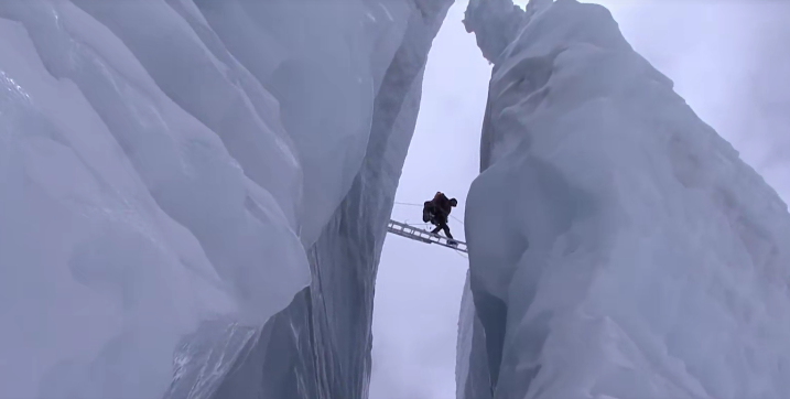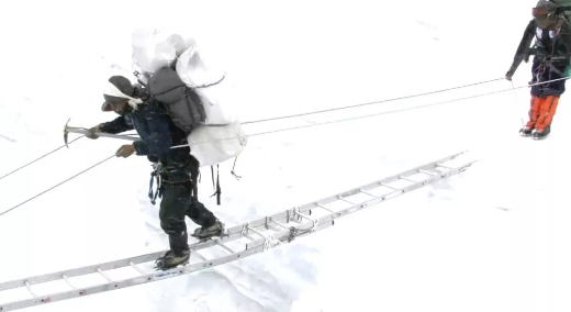 納姆巴爾一行人為了撿拾垃圾,必須穿越隨時(shí)可能發(fā)生雪崩的冰川瀑布,用獨(dú)木梯通過(guò)兇險(xiǎn)的峽谷。