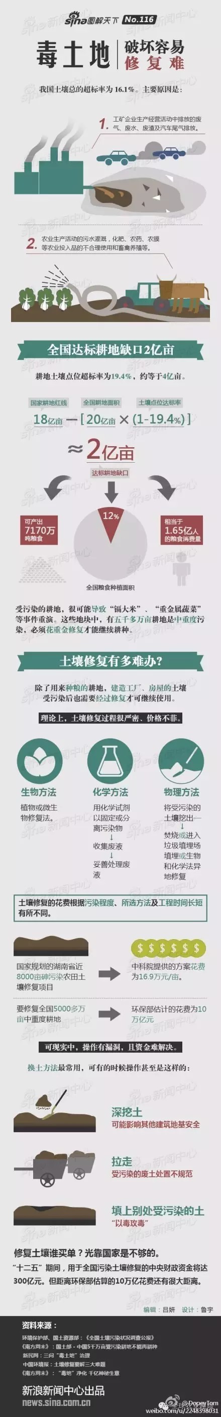 2016-12-09 全球農(nóng)業(yè)趣聞英媒稱,中國(guó)將展開(kāi)全國(guó)性調(diào)查,以查明重金屬、化學(xué)物質(zhì)和其他有毒污染物熱點(diǎn)區(qū)域。目前中國(guó)正試圖清理土壤污染,這可能需要投入1萬(wàn)億美元。