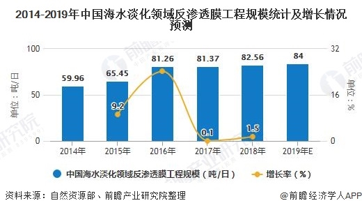 3、2019年中國(guó)海水淡化領(lǐng)域反滲透膜應(yīng)用規(guī)模約為84萬噸/日