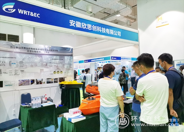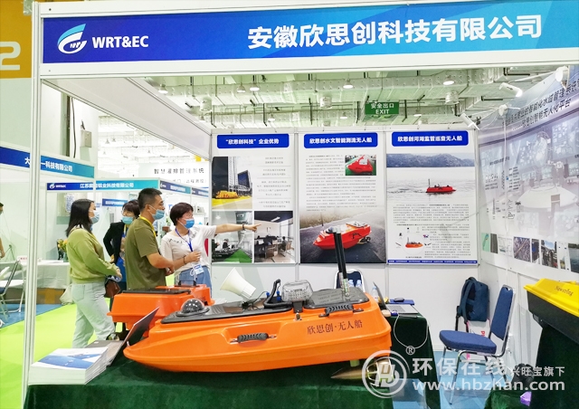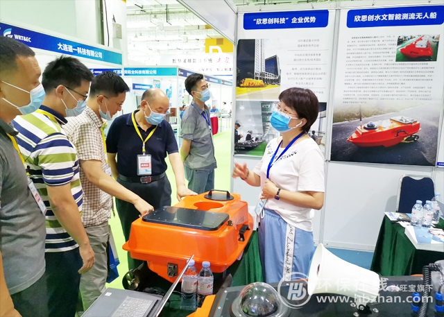 圖為展會(huì)期間,欣思創(chuàng)相關(guān)參展工作人員為專業(yè)人士介紹水文智能測(cè)流無(wú)人船