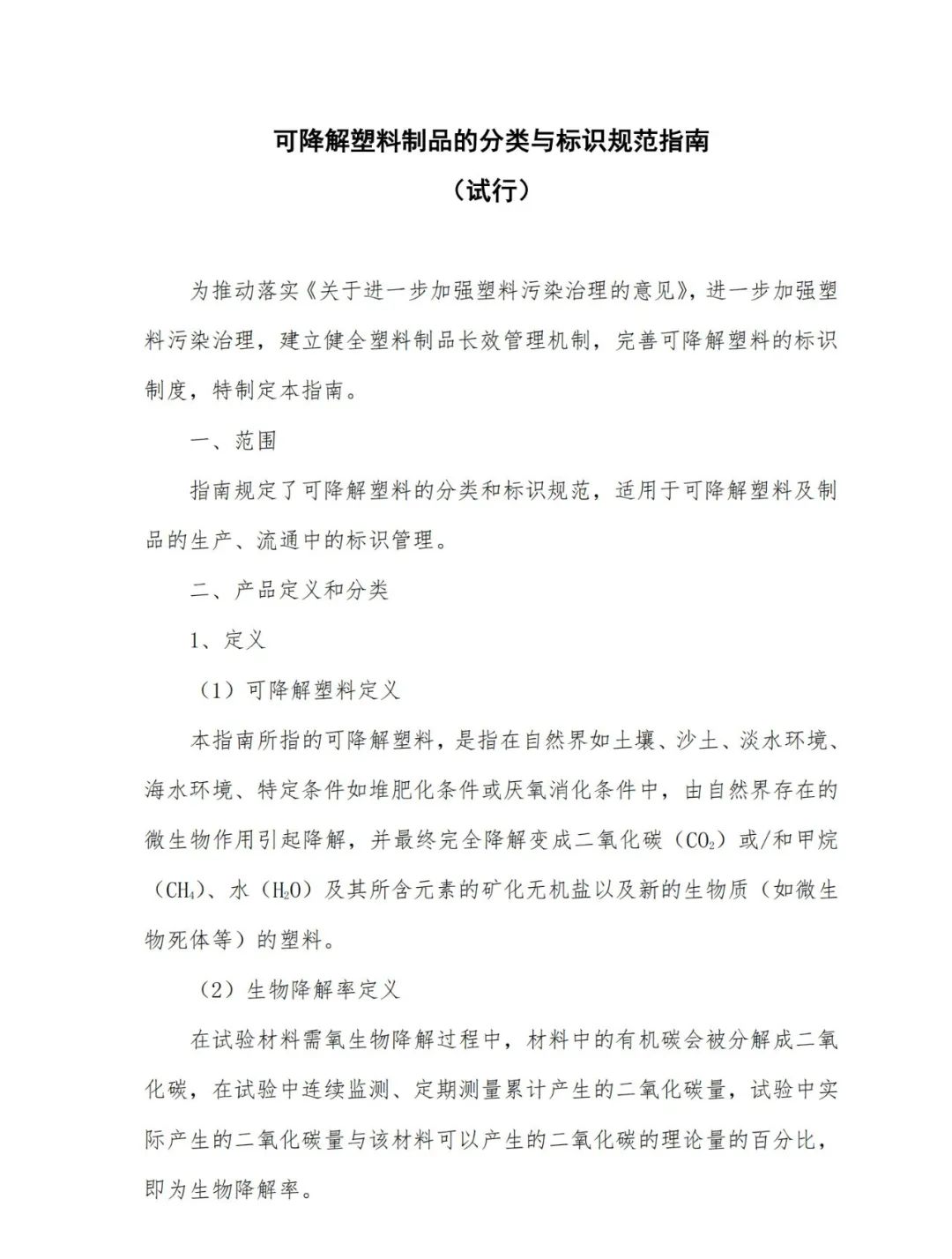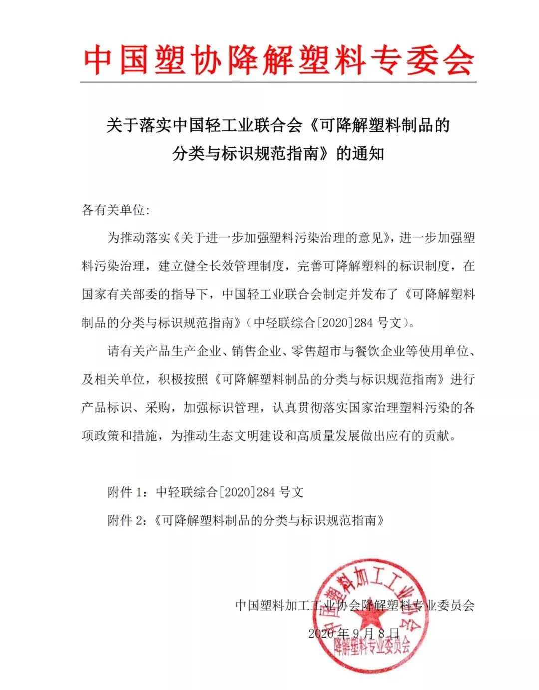 《倡議書(shū)》提出,將以可循環(huán)、易回收、可降解為導(dǎo)向,加大科技創(chuàng)新力度,研發(fā)性能達(dá)標(biāo)、綠色環(huán)保、經(jīng)濟(jì)適用的塑料材料與制品。同時(shí),加快相關(guān)標(biāo)準(zhǔn)研制,完善有關(guān)塑料再生利用標(biāo)準(zhǔn)體系,發(fā)布《可降解塑料的分類與標(biāo)識(shí)要求指南》及再生塑料系列標(biāo)準(zhǔn),按照可降解塑料綠色設(shè)計(jì)評(píng)價(jià)標(biāo)準(zhǔn),開(kāi)展綠色設(shè)計(jì)產(chǎn)品評(píng)價(jià)認(rèn)定,為建立規(guī)范回收和循環(huán)利用的產(chǎn)業(yè)體系提供技術(shù)支撐。9月8日,中國(guó)輕工業(yè)聯(lián)合會(huì)發(fā)布《可降解塑料的分類與標(biāo)識(shí)要求指南》通知,通知如下: