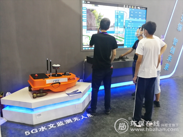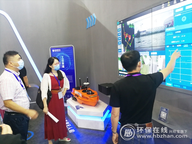 圖為展會(huì)現(xiàn)場相關(guān)工作人員介紹河湖監(jiān)管巡查無人船及水質(zhì)監(jiān)測無人船應(yīng)用平臺(tái)