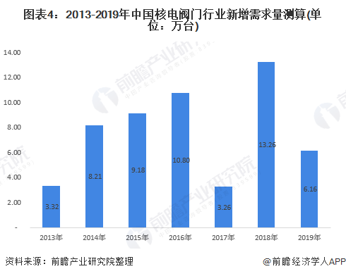 前瞻依照上述邏輯測(cè)算,2013年中國(guó)核電閥門需求量為3.32萬(wàn)臺(tái),其中2018年為近年最高,達(dá)到13.26萬(wàn)臺(tái)。通過(guò)數(shù)據(jù)發(fā)現(xiàn),核電閥門需求量與中國(guó)核電投資額的變化基本一致,這也說(shuō)明核電閥門新增需求行業(yè)發(fā)展嚴(yán)重依賴上游核電公司。
