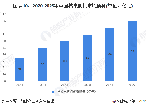 根據(jù)中國(guó)政府發(fā)布的十三五計(jì)劃和《中國(guó)能源中長(zhǎng)期(2030-2050)發(fā)展戰(zhàn)略研究》,中國(guó)政府規(guī)劃以每年6-8座的速度新建核電站,并為引進(jìn)自主開(kāi)發(fā)的新型核電站將投入共5000億元資金。依照過(guò)去十幾年中國(guó)核電建設(shè)速度來(lái)看,6-8座核電站(12-16個(gè)機(jī)組)顯然是不太現(xiàn)實(shí),前瞻假設(shè)以每年新建3座核電站計(jì)算,每座核電站裝配兩個(gè)機(jī)組(共6個(gè)機(jī)組),且每年3座核電站(6個(gè)機(jī)組)都在當(dāng)年年底之前投入運(yùn)營(yíng)。通過(guò)對(duì)新增裝機(jī)部分需求和已運(yùn)營(yíng)電機(jī)部分進(jìn)行計(jì)算,前瞻預(yù)測(cè)2025年中國(guó)核電閥門市場(chǎng)將會(huì)達(dá)到86億元。