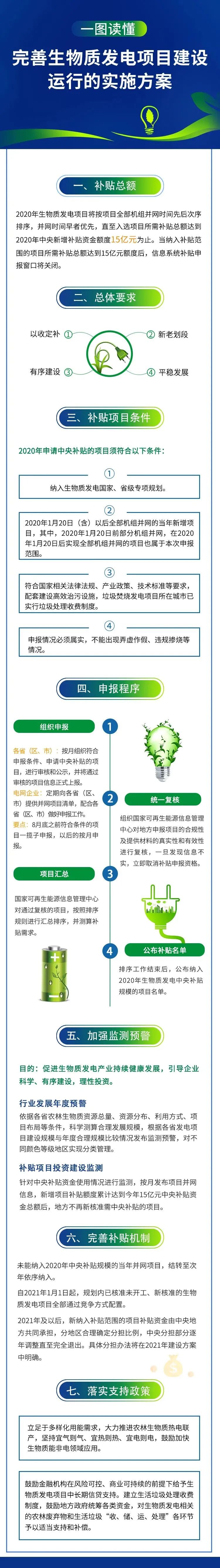 補貼總額:2020年生物質(zhì)發(fā)電新增項目中央年度補貼額度為15億元。申報條件。須納入國家及省級有關(guān)規(guī)劃;污染物排放達標;2020年1月20日(含)之后項目全部機組并網(wǎng)投運;若是垃圾焚燒發(fā)電,項目所在城市已實行垃圾處理收費制度;企業(yè)須自我信用承諾。對不誠信者將納入國家征信體系,將影響企業(yè)的投融資和日常經(jīng)營活動。如何申報。各省按月組織企業(yè)申報(2020年8月底之前符合條件的項目可一攬子申報)并負責初審;有關(guān)部門組織國家可再生能源信息中心對地方申報項目進行復核。對信息不實項目,直接取消補貼資格。