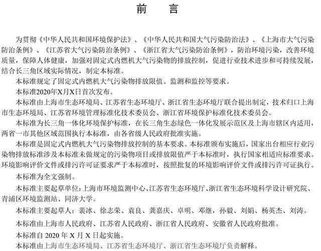 為貫徹落實(shí)《長(zhǎng)江三角洲區(qū)域一體化發(fā)展規(guī)劃綱要》,推進(jìn)長(zhǎng)三角生態(tài)綠色一體化發(fā)展示范區(qū)標(biāo)準(zhǔn)統(tǒng)一工作,上海市生態(tài)環(huán)境局、江蘇省生態(tài)環(huán)境廳、浙江省生態(tài)環(huán)境廳共同組織起草了固定式內(nèi)燃機(jī)大氣污染物排放標(biāo)準(zhǔn)(征求意見稿)。