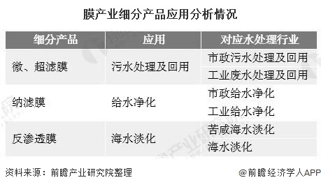 水處理作為膜產(chǎn)業(yè)下游的一個重要應(yīng)用領(lǐng)域,也是膜材料的主要去向:微濾膜主要應(yīng)用于污水、廢水處理等領(lǐng)域;超濾膜在污水、廢水處理及回用和給水凈水領(lǐng)域應(yīng)用廣泛;納濾膜主要應(yīng)用于純凈水、軟化水、無離子水、海水淡化等方面;而反滲透膜可應(yīng)用在海水淡化等領(lǐng)域。