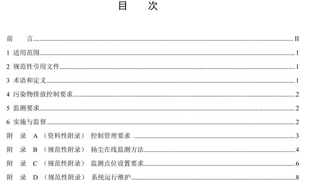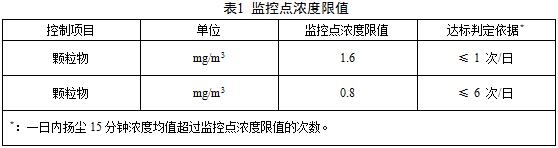 本標(biāo)準(zhǔn)規(guī)定了包括揚(yáng)塵監(jiān)控點(diǎn)濃度限值、最高允許超標(biāo)頻次、監(jiān)測(cè)和監(jiān)控等要求。
