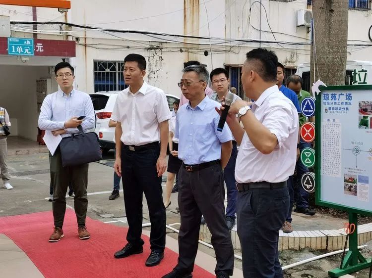 張小宏司長現(xiàn)場調(diào)研瓊苑廣場小區(qū)垃圾分類開展情況,美蘭區(qū)區(qū)長陳積衛(wèi)在點(diǎn)上匯報(bào)。