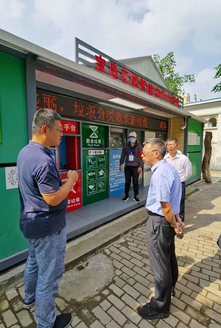 在龍華區(qū)濱海街道寶島花園,張小宏司長聽取街道辦工作人員介紹小區(qū)垃圾分類工作開展情況。