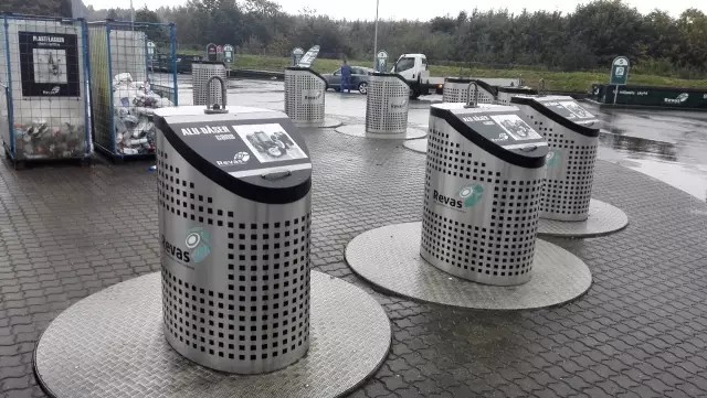 Revas的垃圾分類回收站有一個(gè)區(qū)域分布了幾個(gè)樣式別致的小垃圾桶,這些小垃圾桶是專供飲料罐和瓶子的,居民直接可通過這些垃圾桶把飲料罐和瓶子扔到地下的大集裝箱中,據(jù)Poul M?ller先生介紹,回收站地底下有100個(gè)集裝箱箱子用于飲料罐和瓶子的回收。