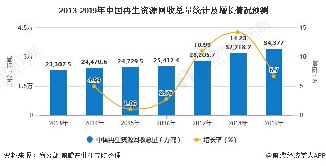 根據(jù)商務(wù)部發(fā)布的《中國(guó)再生資源回收行業(yè)發(fā)展報(bào)告(2019)》數(shù)據(jù)顯示,2018年,我國(guó)廢鋼鐵、廢有色金屬、廢塑料、廢輪胎、廢紙、廢棄電器電子產(chǎn)品、報(bào)廢機(jī)動(dòng)車、廢舊紡織品、廢玻璃、廢電池十大類別的再生資源回收總量為3.20億噸,同比增長(zhǎng)13.4%。根據(jù)2013-2018年6.7%的年復(fù)合增長(zhǎng)率,估算2019年我國(guó)再生資源回收總量在34377萬(wàn)噸左右。