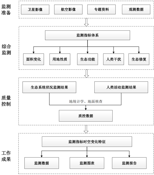 采用衛(wèi)星遙感、近地面航空遙感(無人機)、地面監(jiān)測相結(jié)合,以衛(wèi)星遙感監(jiān)測為主的技術(shù)方法,即先利用高時空衛(wèi)星遙感開展監(jiān)測因子普查,然后利用無人機對典型地區(qū)進行抽查,再到野外現(xiàn)場開展關(guān)鍵生態(tài)因子監(jiān)測和存疑斑塊核查。