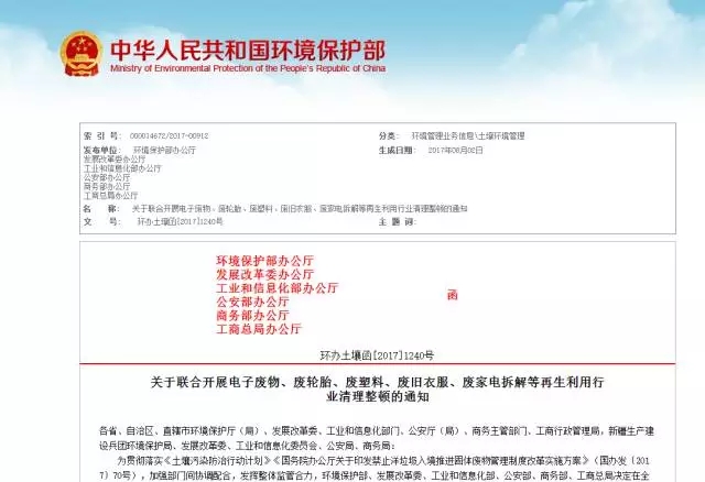 為貫徹落實《土壤污染防治行動計劃》《國務院辦公廳關于印發(fā)禁止洋垃圾入境推進固體廢物管理制度改革實施方案》(國辦發(fā)〔2017〕70號),加強部門間協(xié)調(diào)配合,發(fā)揮整體監(jiān)管合力,環(huán)境保護部、發(fā)展改革委、工業(yè)和信息化部、公安部、商務部、工商總局決定在全國范圍內(nèi)開展電子廢物、廢輪胎、廢塑料、廢舊衣服、廢家電拆解等再生利用行業(yè)清理整頓。現(xiàn)將《電子廢物、廢輪胎、廢塑料、廢舊衣服、廢家電拆解等再生利用行業(yè)清理整頓工作方案》印發(fā)給你們,請結合本地實際,抓好貫徹落實。