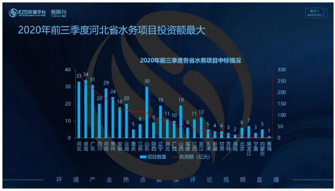 對比不同省份水務(wù)項目中標(biāo)情況,河北、湖南、廣東三省在2020年前三季度釋放的水務(wù)項目投資額排名前三,而項目數(shù)量排名前三的省份分別是湖南、河北和廣東。