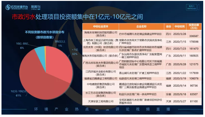 對市政污水類項目按不同投資額劃分(左圖),市政污水處理類項目的單體投資額多在“1億元-10億元”之間,占比達(dá)61%;其次是<1億的項目,占比32%;投資額>10億的市政污水類項目相對較少,占比僅7%。