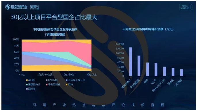 左圖,分析不同投資額區(qū)間水務(wù)項目中標(biāo)企業(yè)類型發(fā)現(xiàn),2020年前三季度,水務(wù)A方陣企業(yè)在小于30億項目中,隨著金額增加占比變化不明顯,當(dāng)項目投資額大于30億,占比明顯減小;C/D方陣企業(yè)則隨著項目投資額增加,占比不斷減小,在<1億的項目中,占比最大,由此說明C/D方陣更傾向投資額相對較小的項目;平臺型國企在各個投資額區(qū)間均占了較大的市場份額,在30億以上項目中,占比最大,近70%。