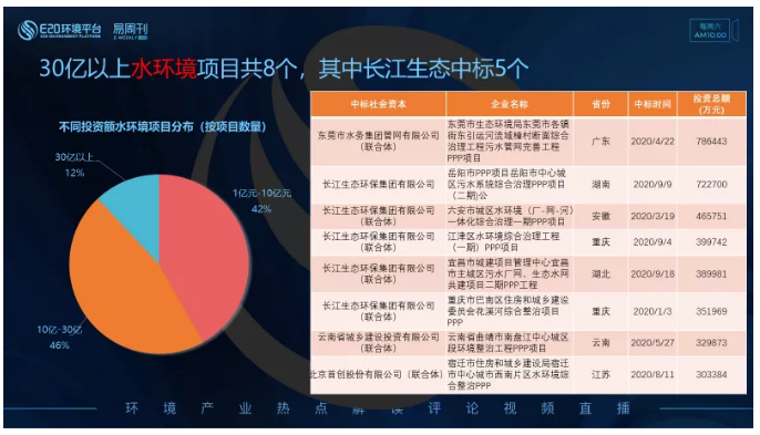 右表為“30億以上水環(huán)境類項目”,共8個,其中長江生態(tài)環(huán)保集團(tuán)有限公司中標(biāo)5個,且僅在9月份就中標(biāo)3個30億以上水環(huán)境項目。