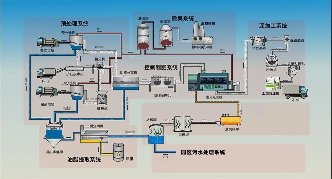 項目采用嘉博文公司好氧+厭氧發(fā)酵工藝和BGB-SCZ-7500型大設備處理系統(tǒng),主工藝為有機廢物生物強化腐殖化和控氧制肥系統(tǒng),充分利用餐廚廢棄物固相中的營養(yǎng)成分,快速降解為生物腐植酸;輔助工藝采用高濃度有機液相厭氧發(fā)酵,產生沼氣可供給鍋爐燃燒回用于工藝用熱,實現(xiàn)沼氣的自身循環(huán)利用;沼液進入污水處理,沼渣回進控氧制肥系統(tǒng)。