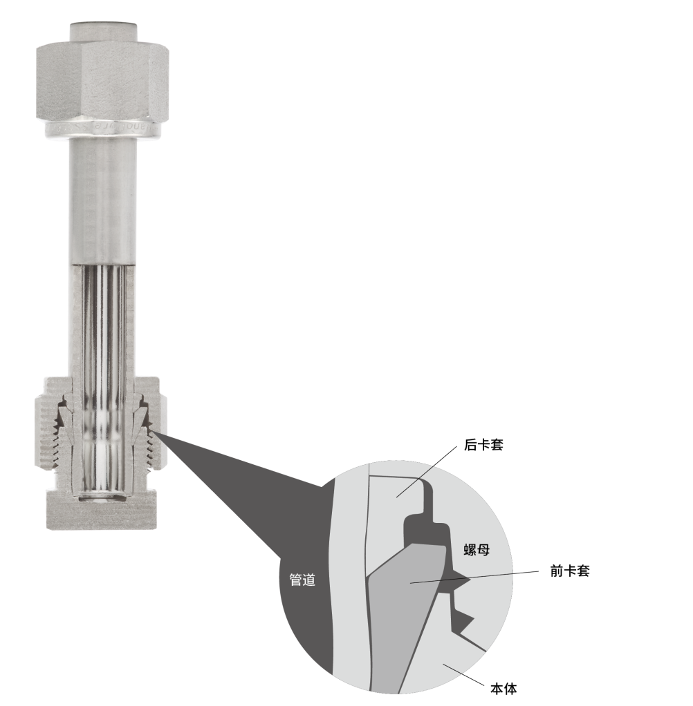 在如上的裝配過程中,前卡套被打入裝配體和管道中,以形成主密封,而后卡套向內(nèi)鉸鏈,以形成對管道的有力抓握。后卡套的幾何結(jié)構(gòu)允許改進(jìn)的工程鉸鏈夾頭作用,將軸向運(yùn)動轉(zhuǎn)化為管子上的徑向擠鍛作用,但在裝配扭矩要求較低的情況下工作。