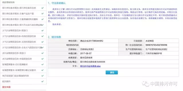 排污單位填寫完所有信息后,點(diǎn)擊“提交”按鈕,即完成排污許可證變更申報(bào)。系統(tǒng)會對變更內(nèi)容進(jìn)行標(biāo)識,綠色文字為排污單位變更過程中新增內(nèi)容,紅色文字為排污單位變更過程中修改內(nèi)容。